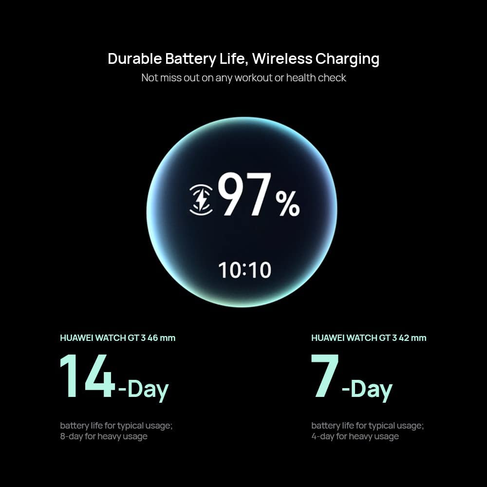 • 【Durable Battery Life】On a full charge, HUAWEI WATCH GT 3 42 mm lasts up to 7 days, so you're fully prepared to keep track of your every workout and not miss out on any health check. It supports wireless charging, so you can use your phone to reverse charge it when you forget your charger and say goodbye to battery life anxiety.