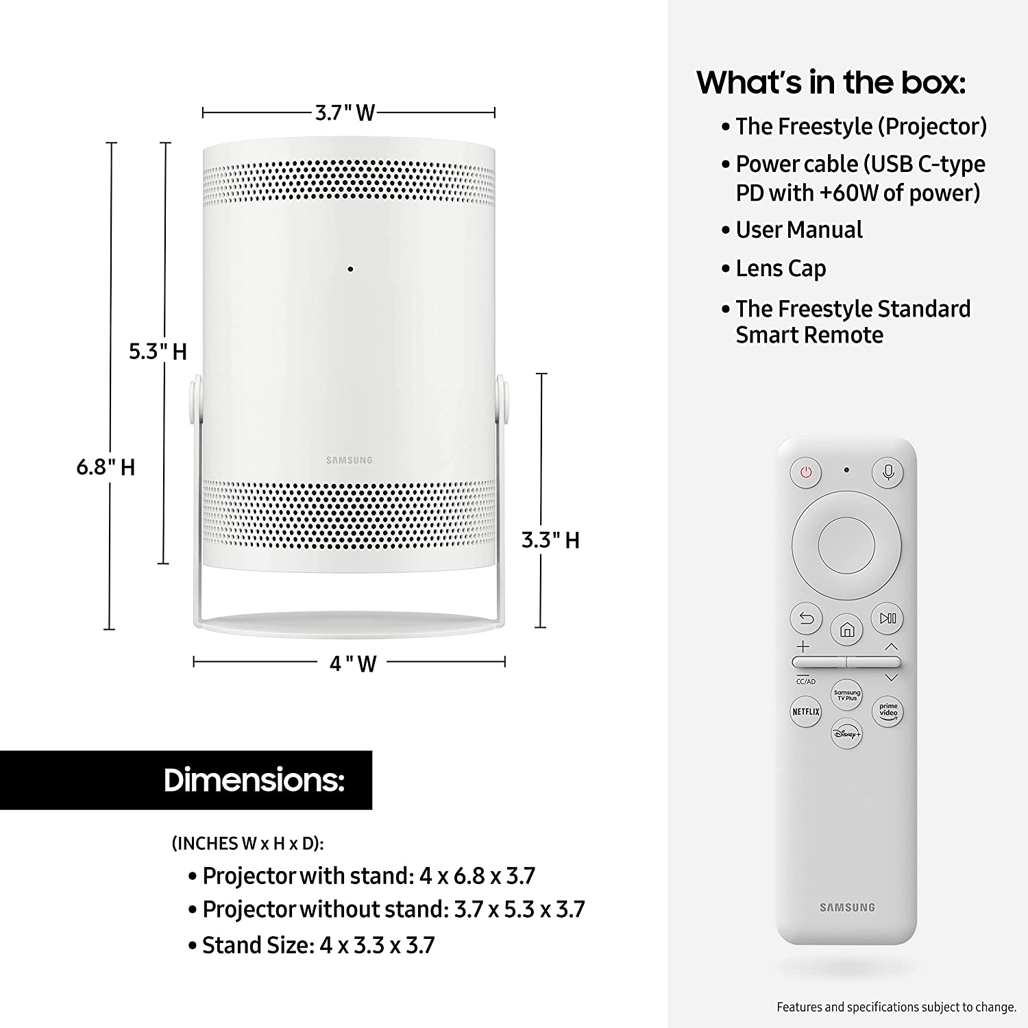 • MULTI VOICE ASSISTANT: Say hello to your favorite Voice Assistant; Bixby, Amazon Alexa and Google Assistant are built into The Freestyle; Simply use your voice to find the content you love, turn up the volume, control your connected home and more