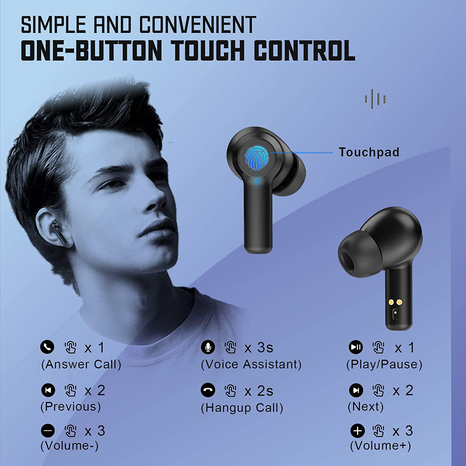• Other Features: The bluetooth ear buds is IPX7 Waterproof, don’t fear about splash and sweat; the bluetooth ear buds will pair automatically when picked up; the ear pods use easy-operation touch button; the case has a widely compatible Type-C fast charging port; the ear buds support native voice assistant like siri; the package comes with 3 ear caps and more for you to discover.